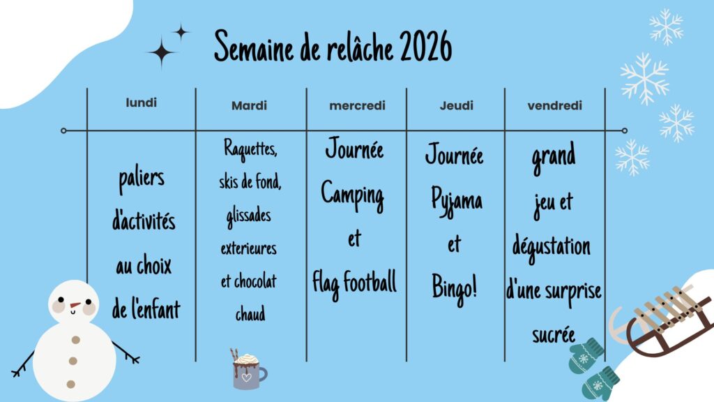 *Congés (camp de jour fermé) : 1er juillet 2026