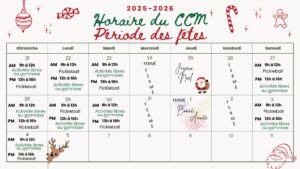 Consultez l’image ci-dessous afin de connaître les activités offertes durant le congé des fêtes. L’horaire régulier reprendra le lundi 5 janvier 2026.