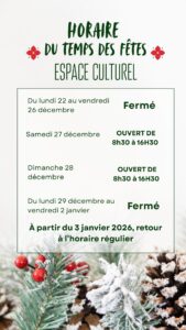 Visitez la bibliothèque avant lundi le 22 décembre afin de faire votre réserve de livres pour le temps des fêtes!  L’horaire régulier reprendra le samedi 3 janvier 2026.