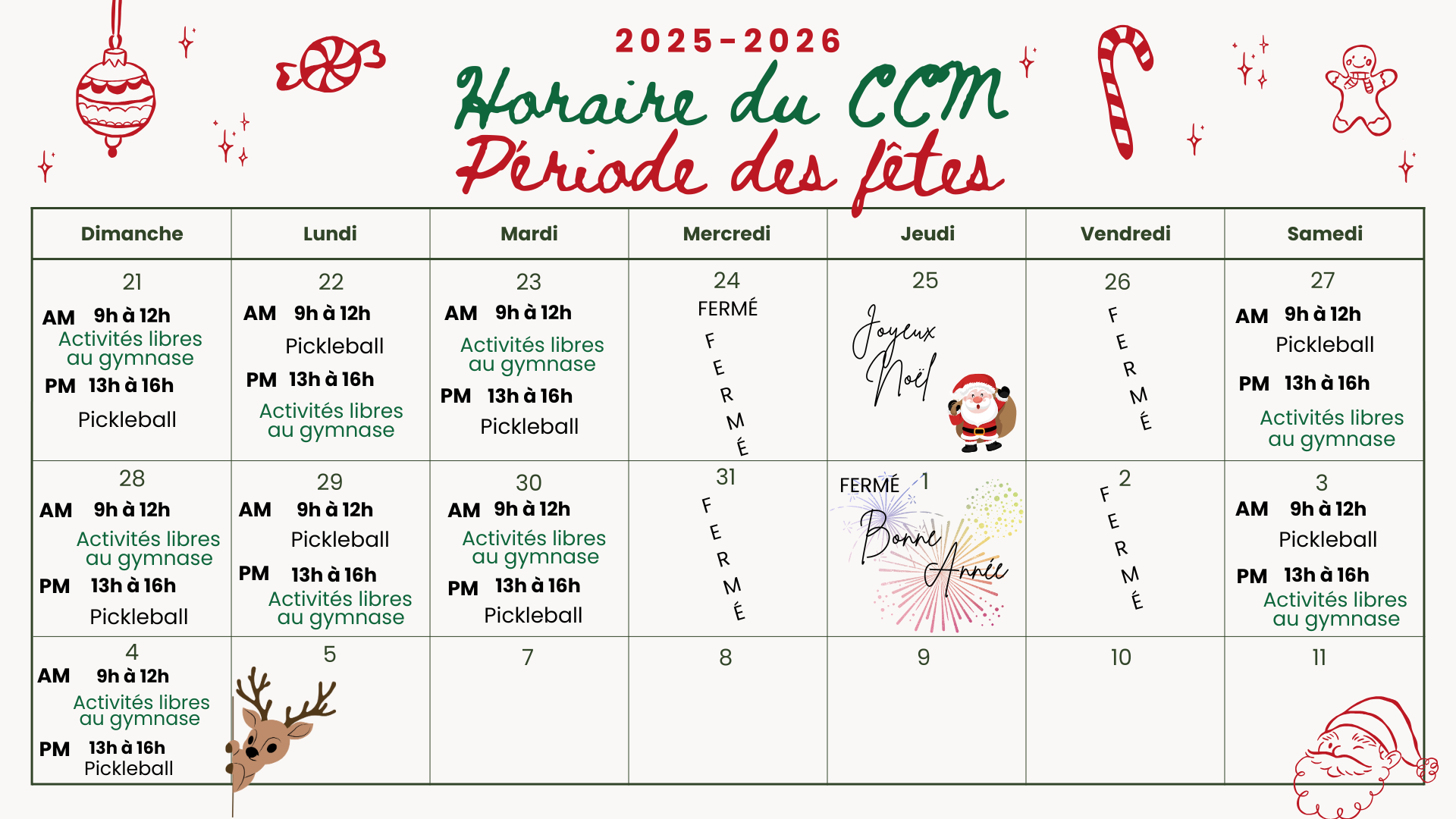 Consultez l'image ci-dessous afin de connaître les activités offertes durant le congé des fêtes. L'horaire régulier reprendra le lundi 5 janvier 2026.