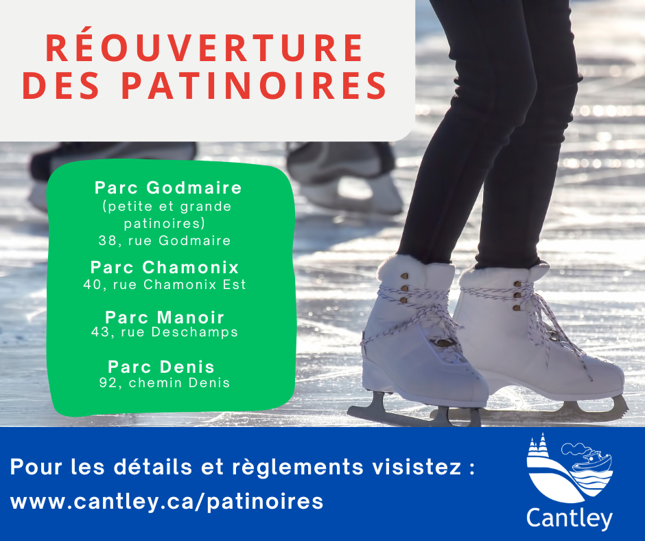 Nous souhaitons vous rappeler l’importance de respecter les règles d’utilisation des patinoires extérieures mises à la disposition de la communauté. Les règlements sont disponibles ici: Municipalité de Cantley | Patinoires.